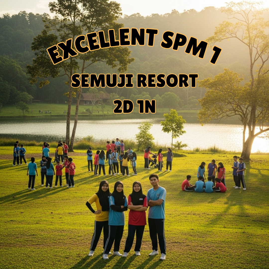 The SPM Excellent 1 program is a 2 days 1 night educational and motivational trip held at Semuji Resort, Gambang, Pahang. The program aims to provide students with recognition, exposure, and learning experiences outside the classroom in a natural and relaxing environment.