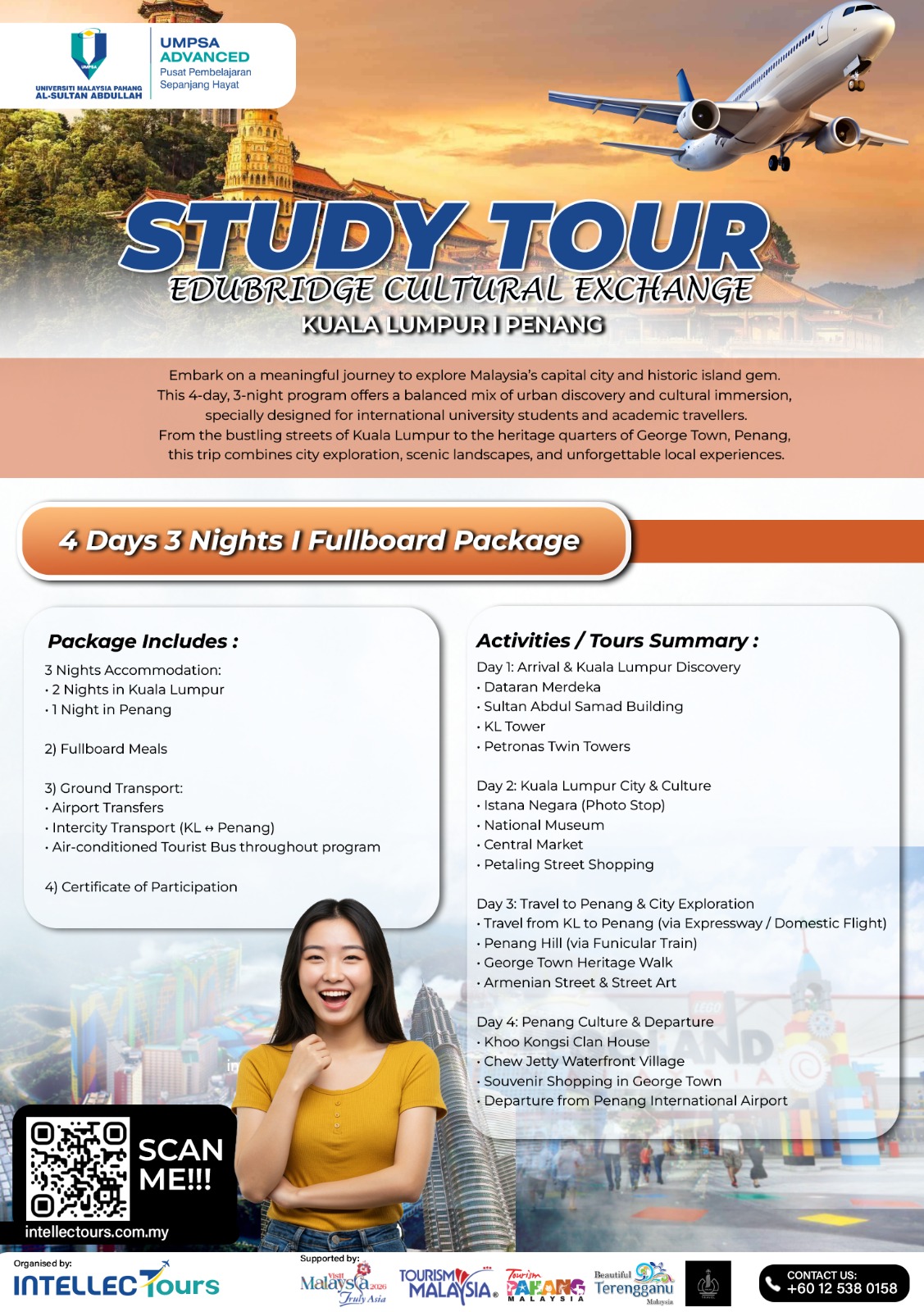 Cultural Escape: Heaven to Penang is a specially curated cultural and experiential journey designed to showcase the vibrant heritage, diversity, and charm of Penang — known as the cultural heart of Malaysia. This program offers participants the opportunity to explore Penang’s unique blend of tradition and modernity, where history, art, cuisine, and community come together in a truly captivating experience. From visiting iconic heritage sites to engaging in hands-on cultural workshops and tasting authentic local delicacies, participants will immerse themselves in the rich stories and lifestyles that define Penang’s identity. Program objectives include: Promoting appreciation of Penang’s cultural and historical heritage. Encouraging experiential learning through authentic local interactions. Strengthening cultural awareness, teamwork, and engagement through exploration. Inspiring participants with the beauty of Penang’s traditions, arts, and culinary heritage. By the end of the Cultural Escape: Heaven to Penang, participants will not only discover the treasures of Penang but also gain a deeper understanding of Malaysia’s multicultural spirit — a true escape that nourishes both heart and mind.