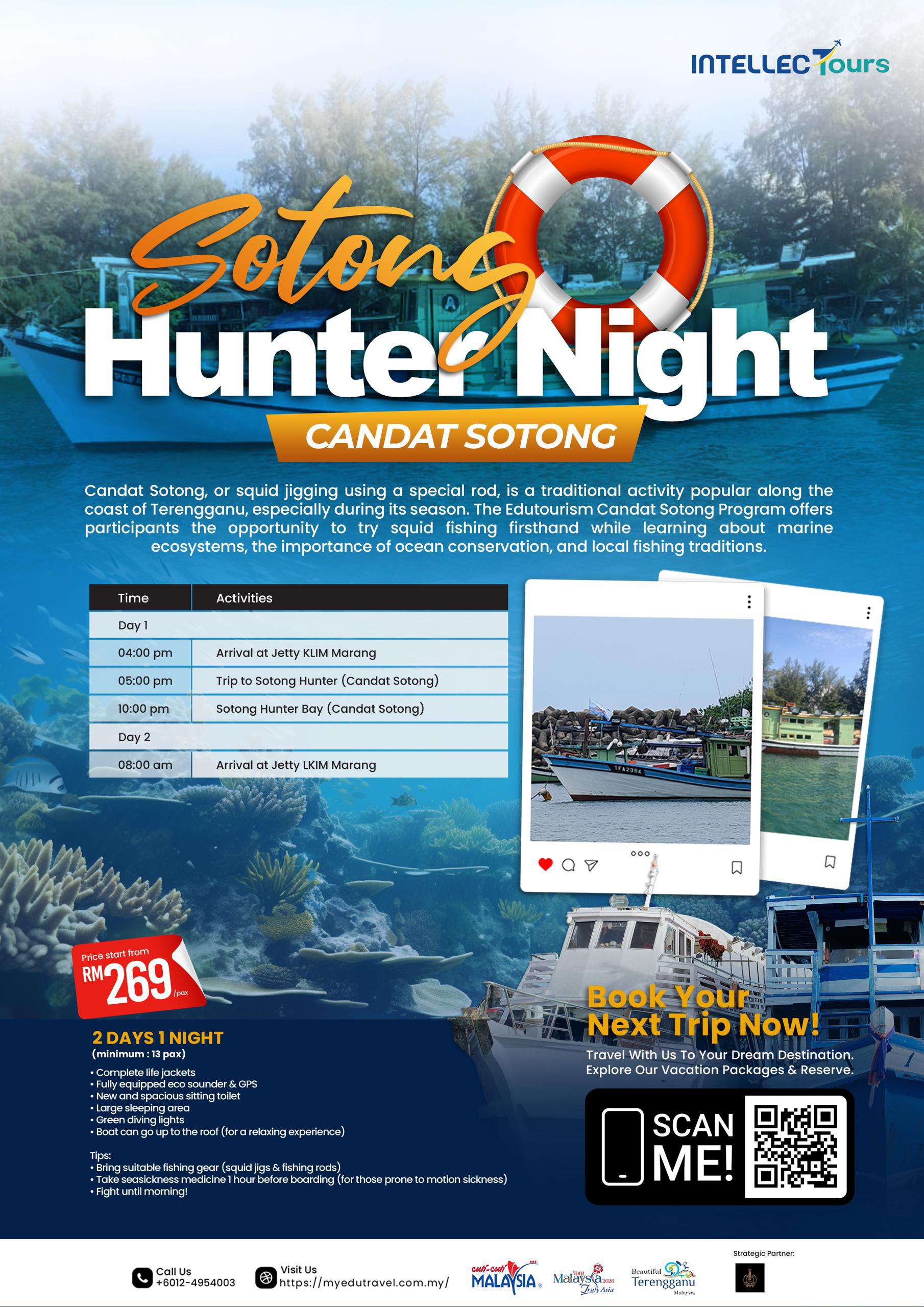 The Eco Tourism: Sotong Hunted Night program offers a unique and exciting nature-based travel experience. Participants will enjoy a night squid-catching activity while experiencing the serene beauty of the sea and the lifestyle of local fishermen. More than just a recreational activity, this program also provides valuable insights into the marine ecosystem, the importance of ocean sustainability, and coastal community traditions. Combining elements of education, tourism, and hands-on experience, it stands out as one of the most memorable eco-tourism attractions for visitors.
