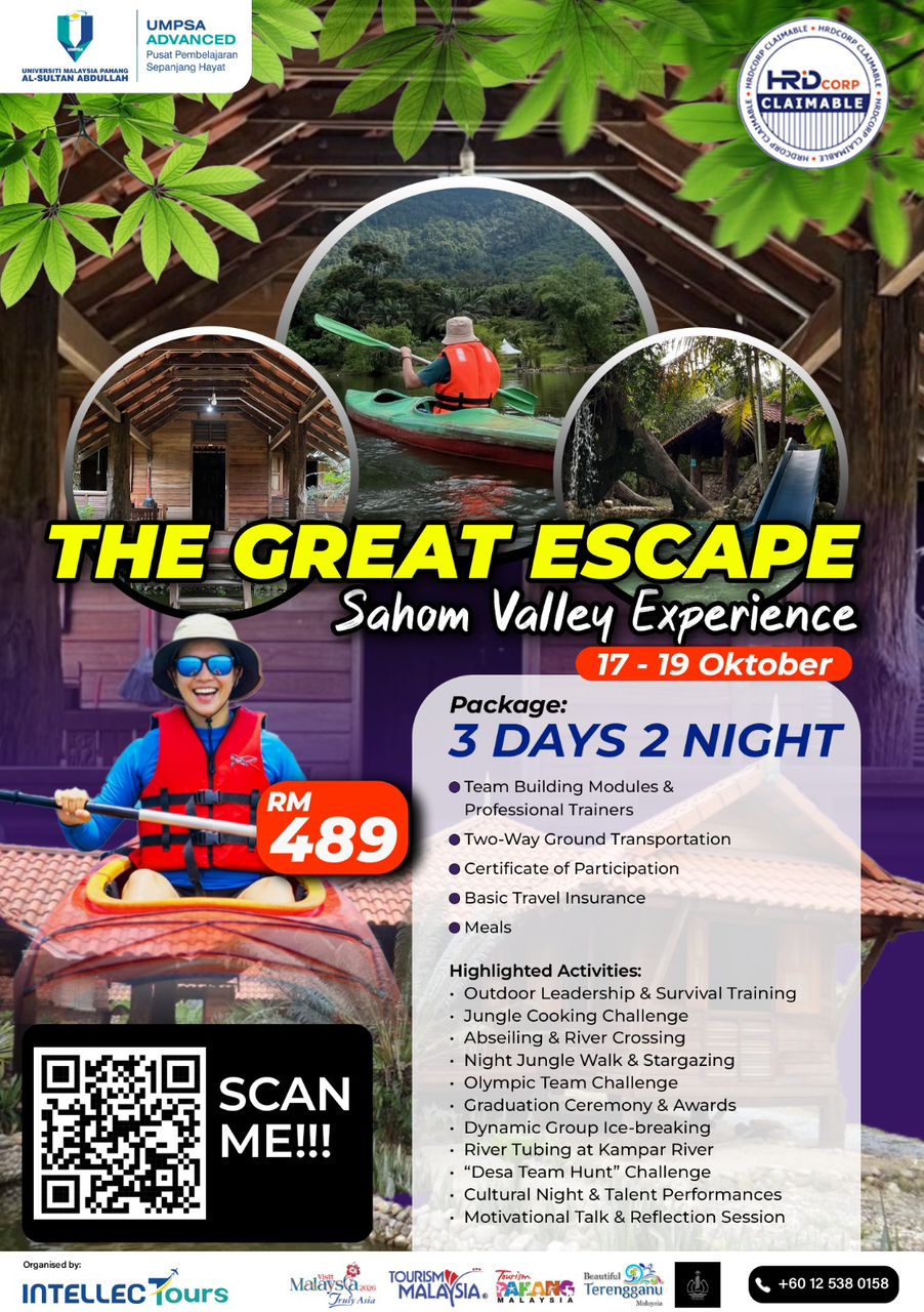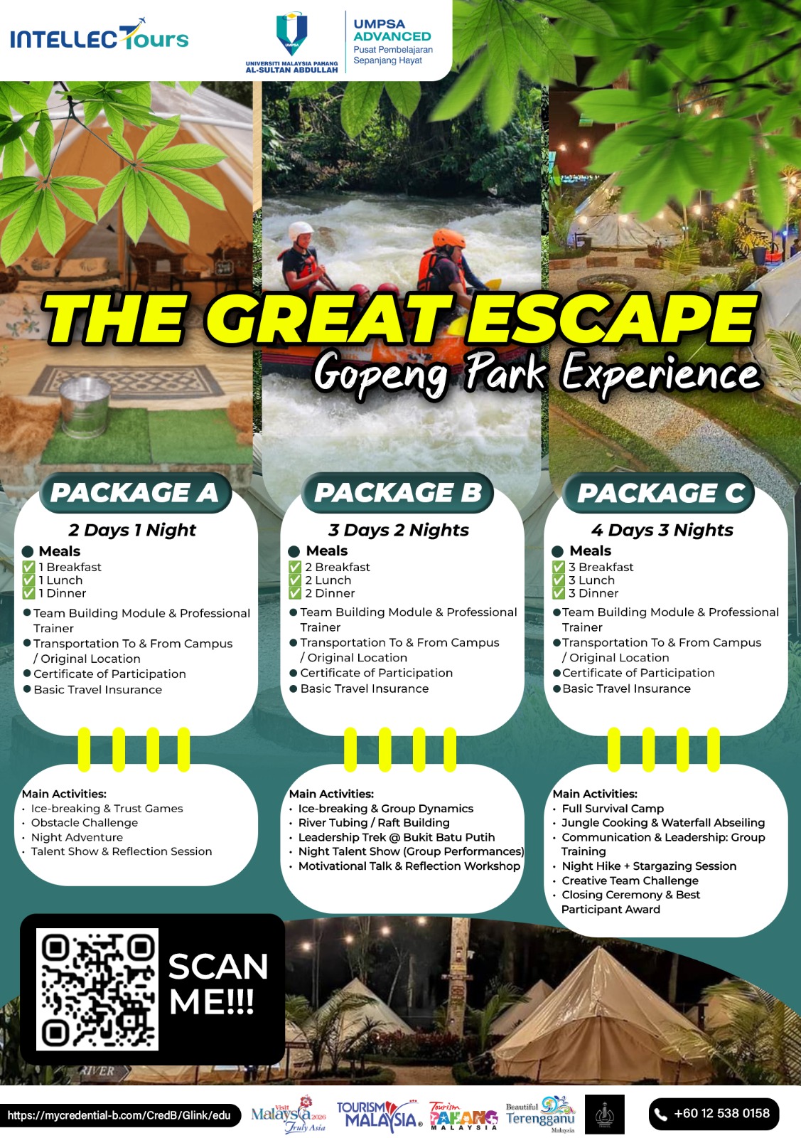 The Great Escape: Gopeng Experience 3D2N is an adventurous 3-day, 2-night getaway set in the natural surroundings of Gopeng. The program offers outdoor activities, nature exploration, and team-based experiences, providing a refreshing escape while promoting bonding, resilience, and adventure.